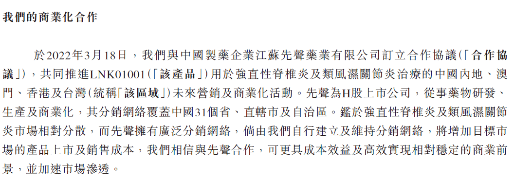 LNK01001与先声药业达成商业化合作协议。