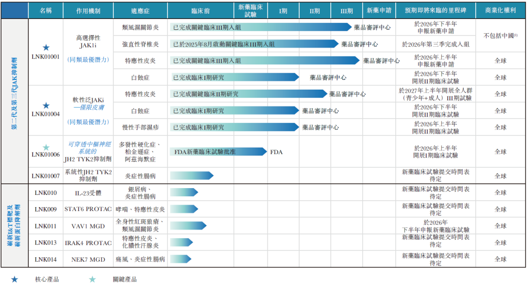 凌科药业成立于2017年,聚焦研发自身免疫及炎症性疾病的差异化小分子创新药,首发管线为高选择性JAK1抑制剂LNK01011,后续管线还有泛JAK抑制剂LNK01004、透脑TYK2抑制剂LNK01006、系统性TYK2抑制剂LNK01007等。临床前管线还有IL-23受体抑制剂、STAT6 PROTAC、IRAK4 PROTAC、VAV1 MGD、NEK7 MGD等。
